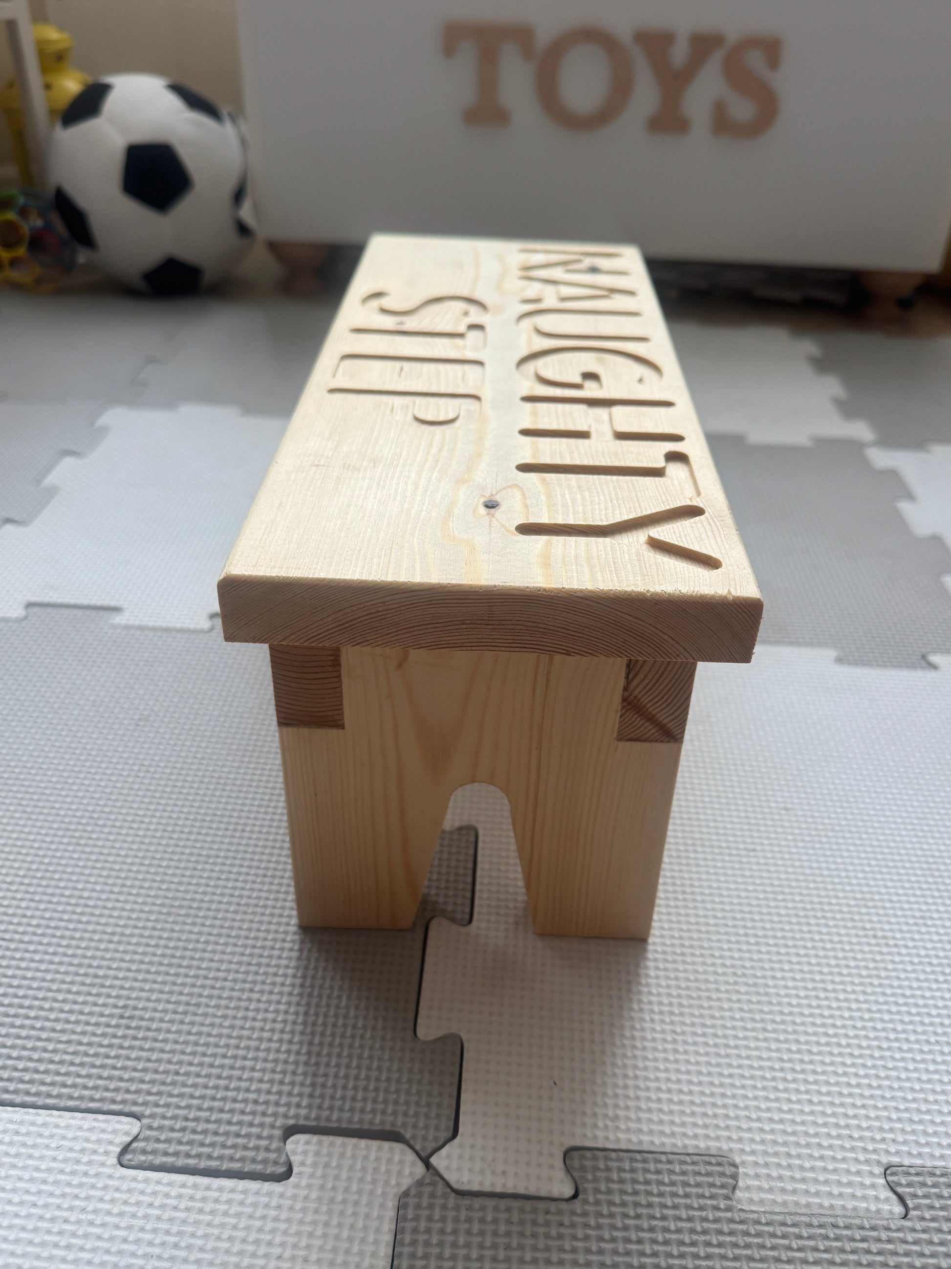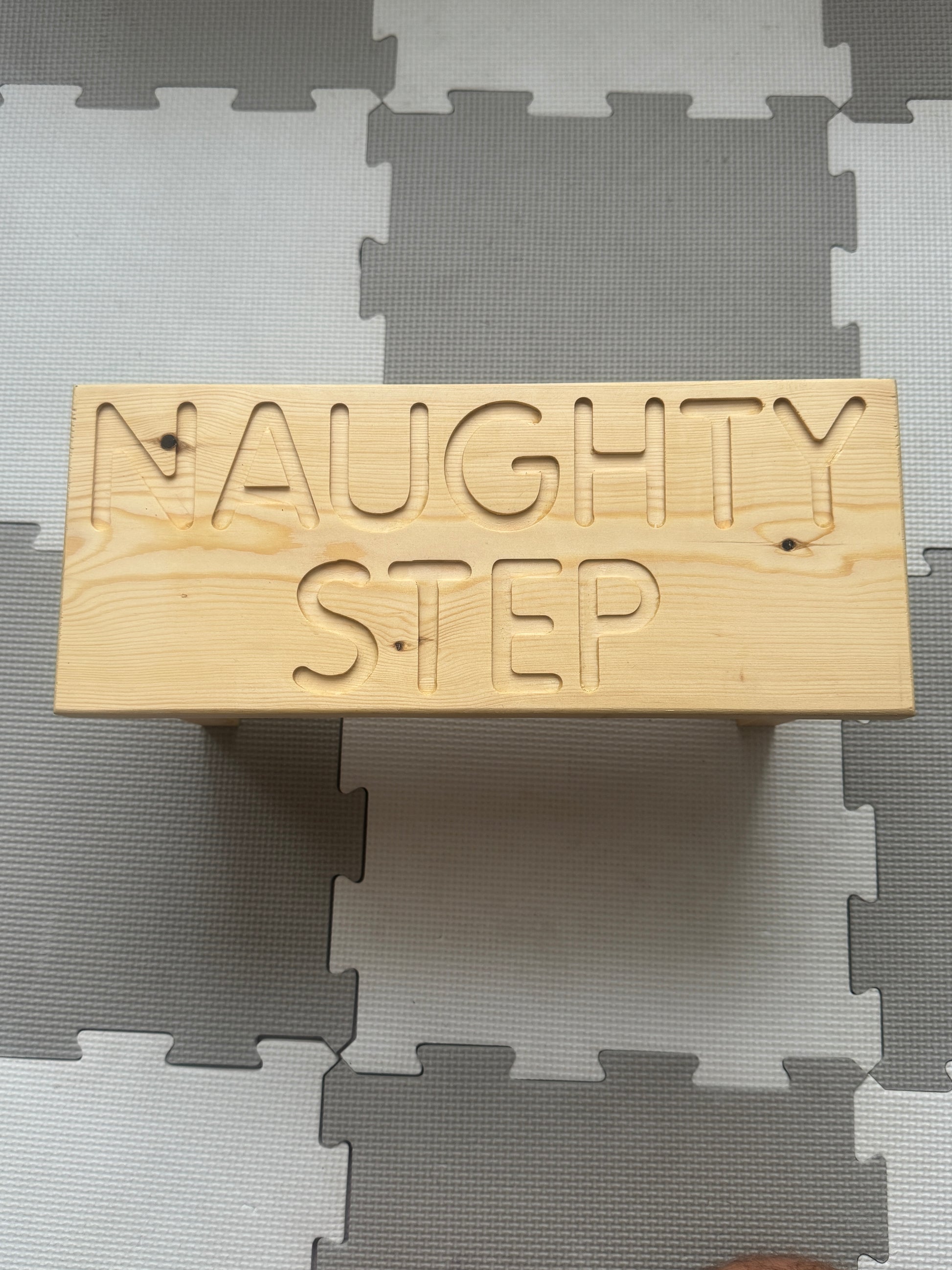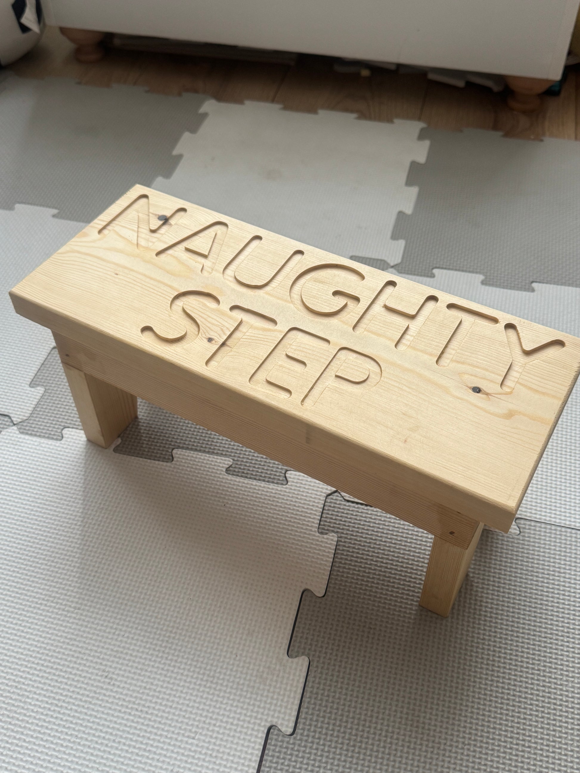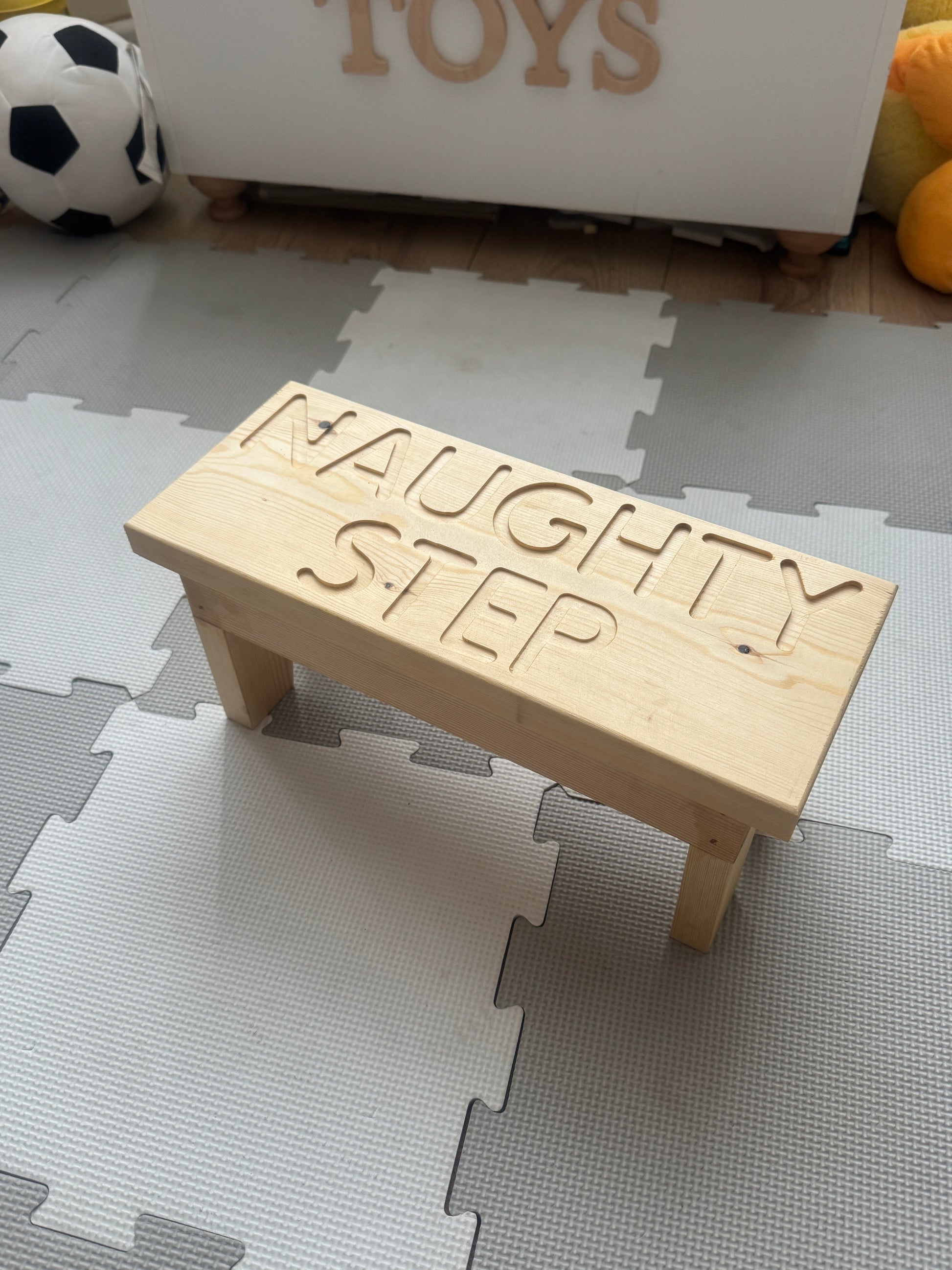 This custom-made, solid wooden naughty step is designed for toddler time-outs. It is durable and well-maintained, featuring a straightforward style that complements various home interiors. Suitable for children aged 2 and older, it supports gentle parenting practices. Additionally, it can serve as a compact stool or seat when needed.